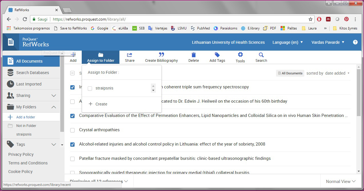 Įrašus iš aplanko All Documents (Visi dokumentai) galite perkelti į kitą aplanką. Ketinamus perkelti įrašus pažymėkite varnele, spustelėkite Assign to Folder (Priskirti aplankui) ir pasirinkite aplanką, į kurį norite perkelti įrašus (žr. 7 pav).