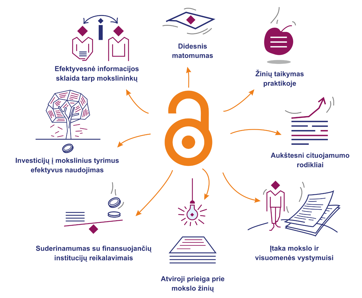 - mokslininkams – prieiga prie naujausių pasaulinių mokslo žinių, mokslo rezultatų sklaida, platesnė skaitytojų auditorija, didesnis matomumas, išaugęs citavimų skaičius, pakartotinis duomenų naudojimas, pripažinimas, išsaugotos autorių teisės, sąlygos teksto ir duomenų gavybai;