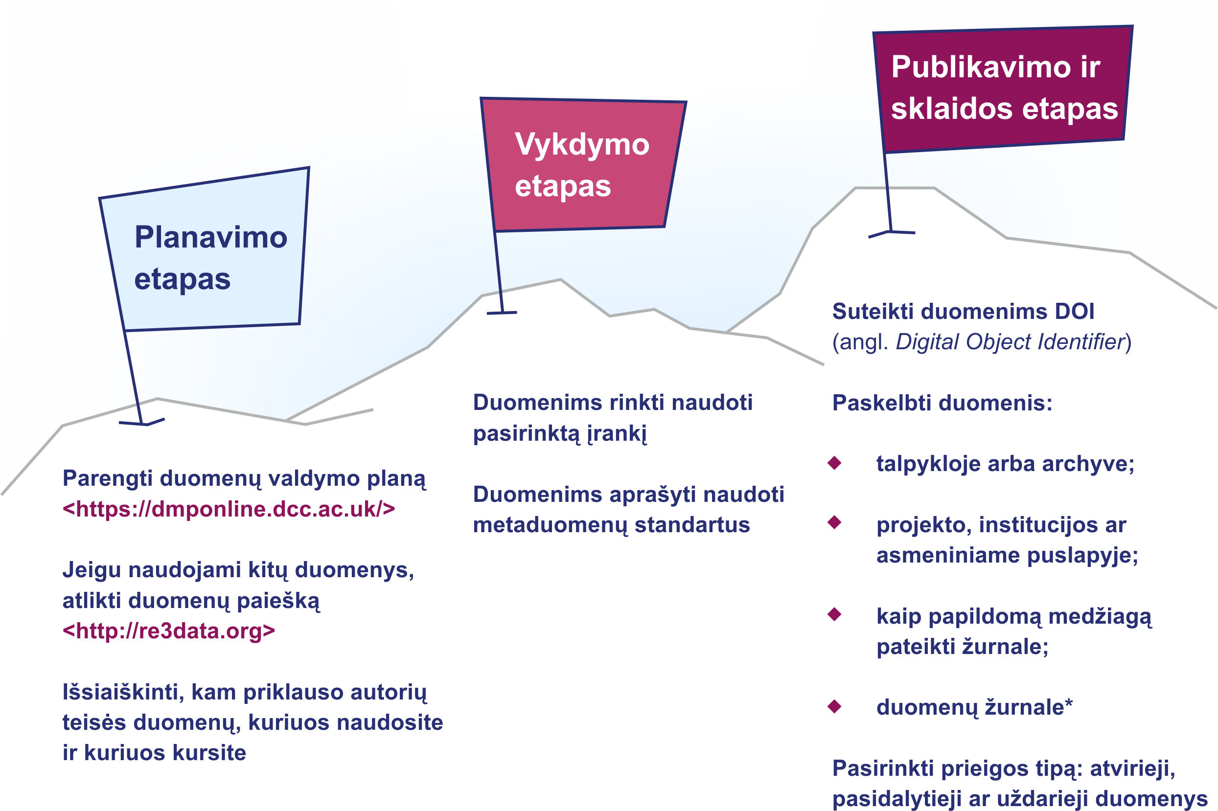 - planuojant tyrimą turi būti numatyta infrastruktūra ir sąlygos, kaip duomenys bus saugomi, kaip bus užtikrinamas jų saugumas, kaip jais bus dalijamasi, kam bus suteikta prieiga;