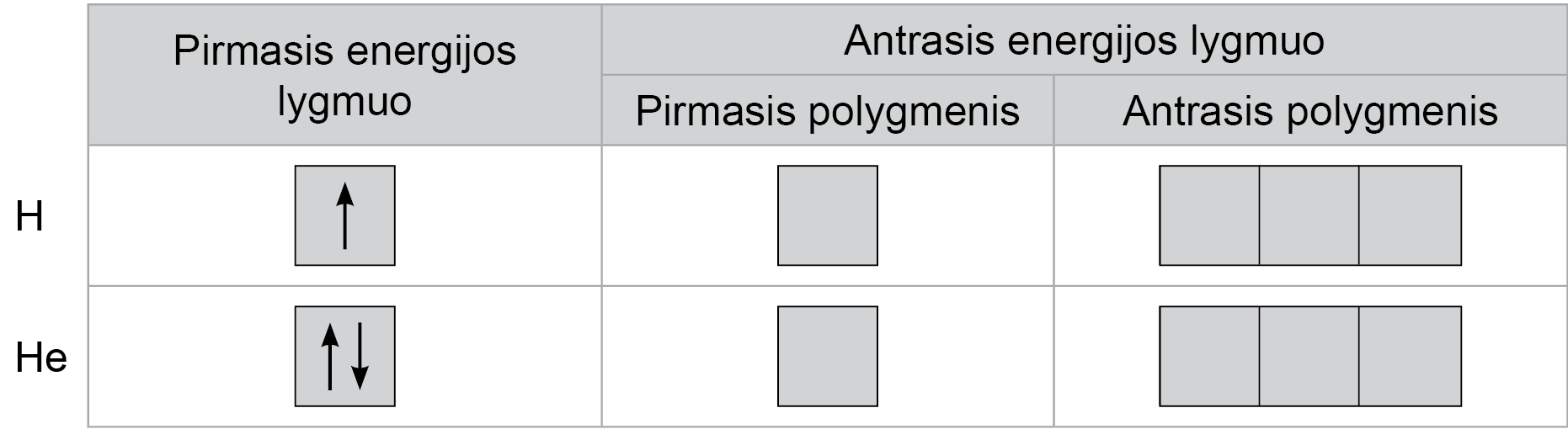 2.1.6. pav. Vandenilio ir helio elektronų išsidėstymas atomų energijos lygmenyje