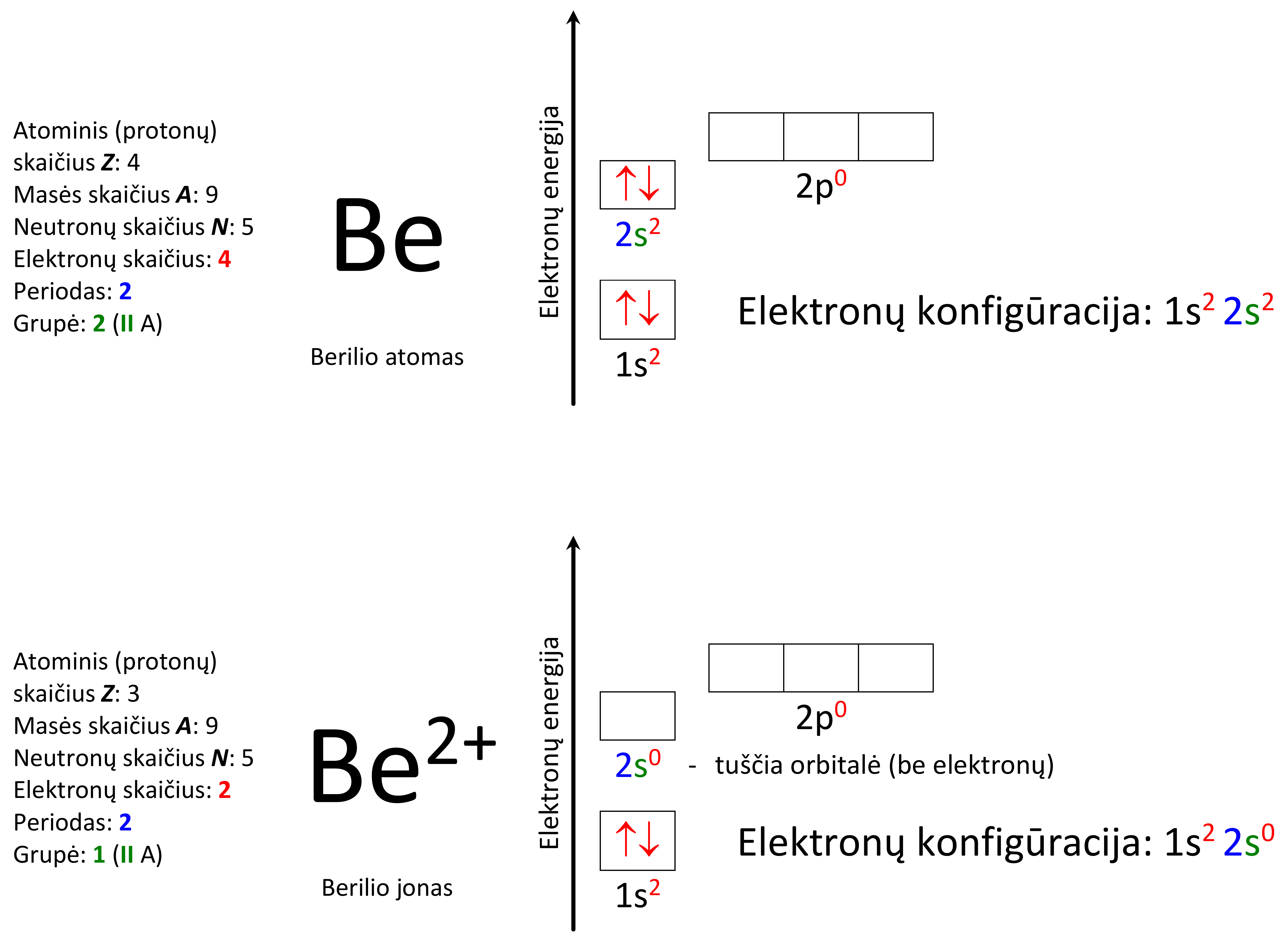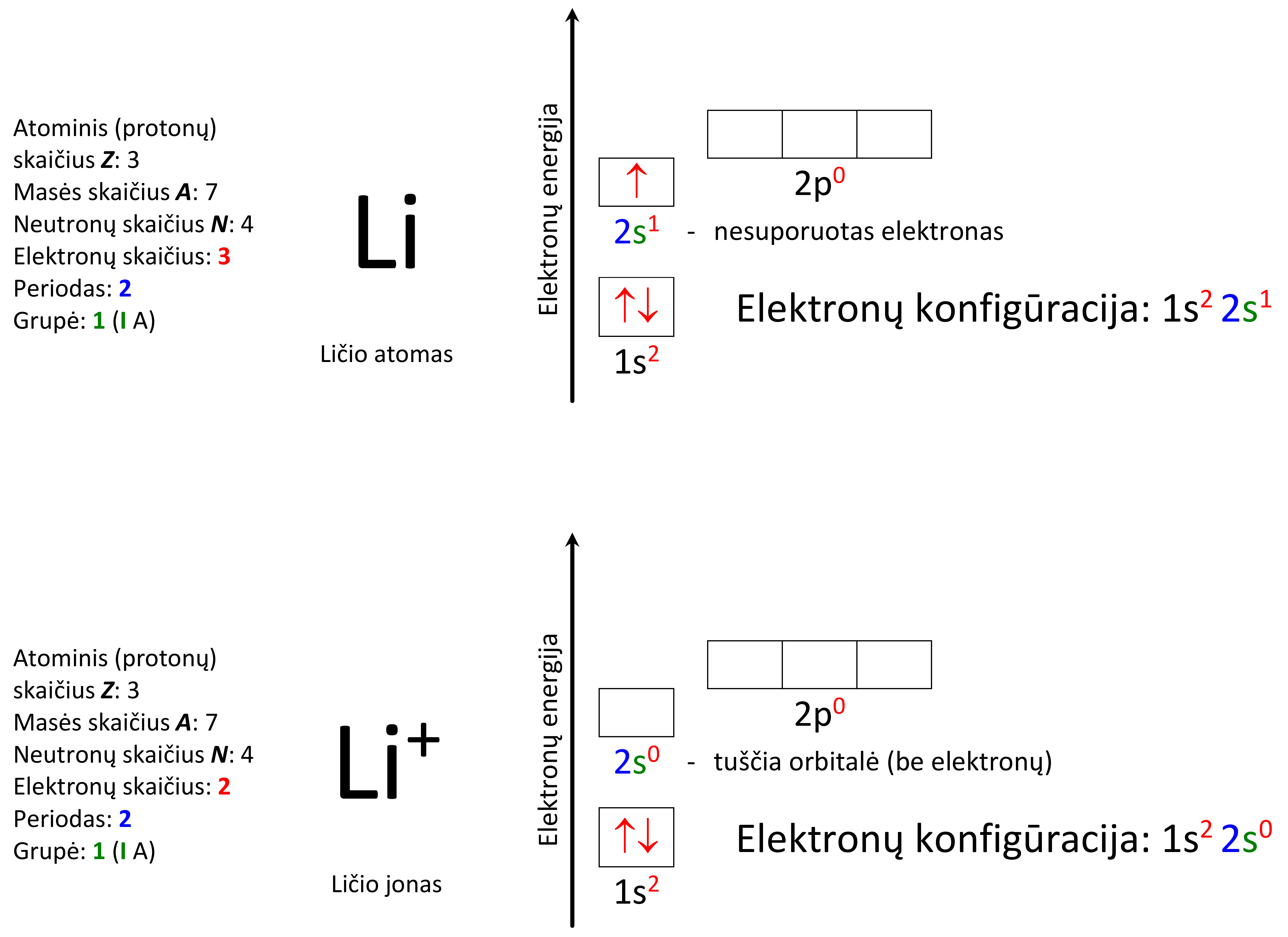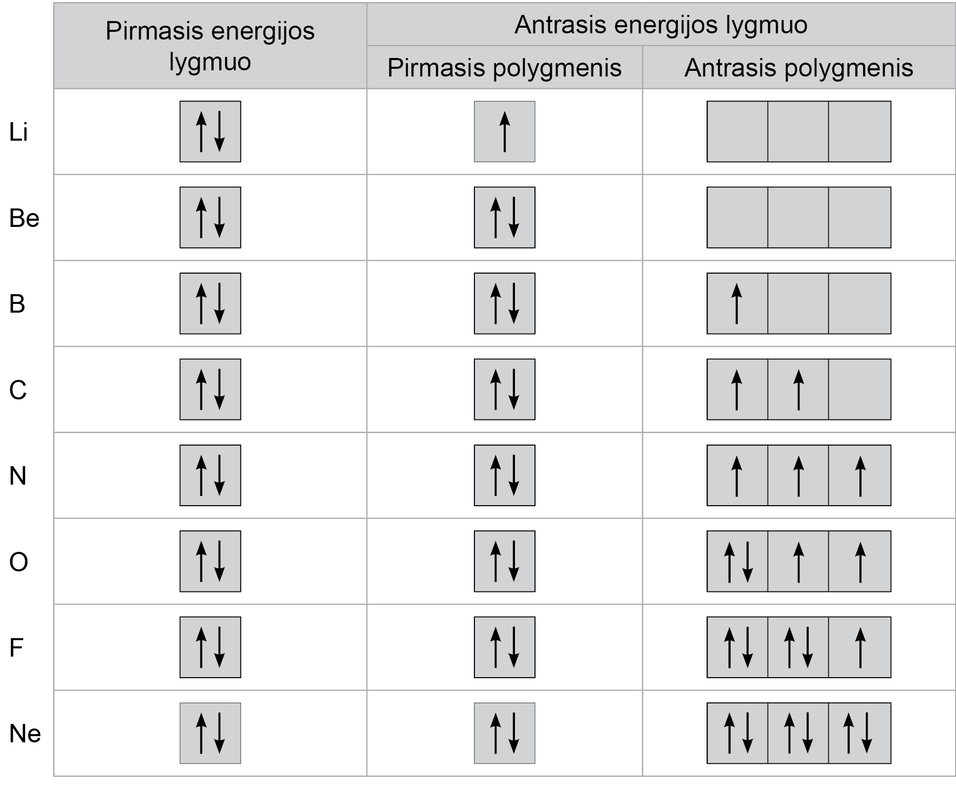 Ličio (Li), kurio atominis skaičius Z = 3, du elektronai užpildo pirmojo energijos lygmens s orbitalę, o trečiasis elektronas pradeda pildyti antrojo energijos lygmens s orbitalę (2.1.7. pav.). Berilio (Be) ketvirtasis elektronas tampa antruoju elektronu toje pačioje antrojo energijos lygmens s orbitalėje. Boro (B) penktasis elektronas pradeda pildyti antrojo energijos lygmens p orbitales (antrąjį polygmenį). Anglies (C) ir azoto (N) atitinkamai šeštasis ir septintasis elektronai pildo vis kitą p orbitalę, o deguonies (Z=8) atomo aštuntasis elektronas tampa antruoju elektronu pirmoje p orbtalėje, nes daugiau laisvų orbitalių nėra. Atitinkamai fluoro (F) ir neono (Ne) devintasis ir dešimtasis elektronai užpildo kitas dvi p orbitales. Neono elektrono konfigūracija yra stabiliausia, nes užpildytos visos elektronų orbitalės.