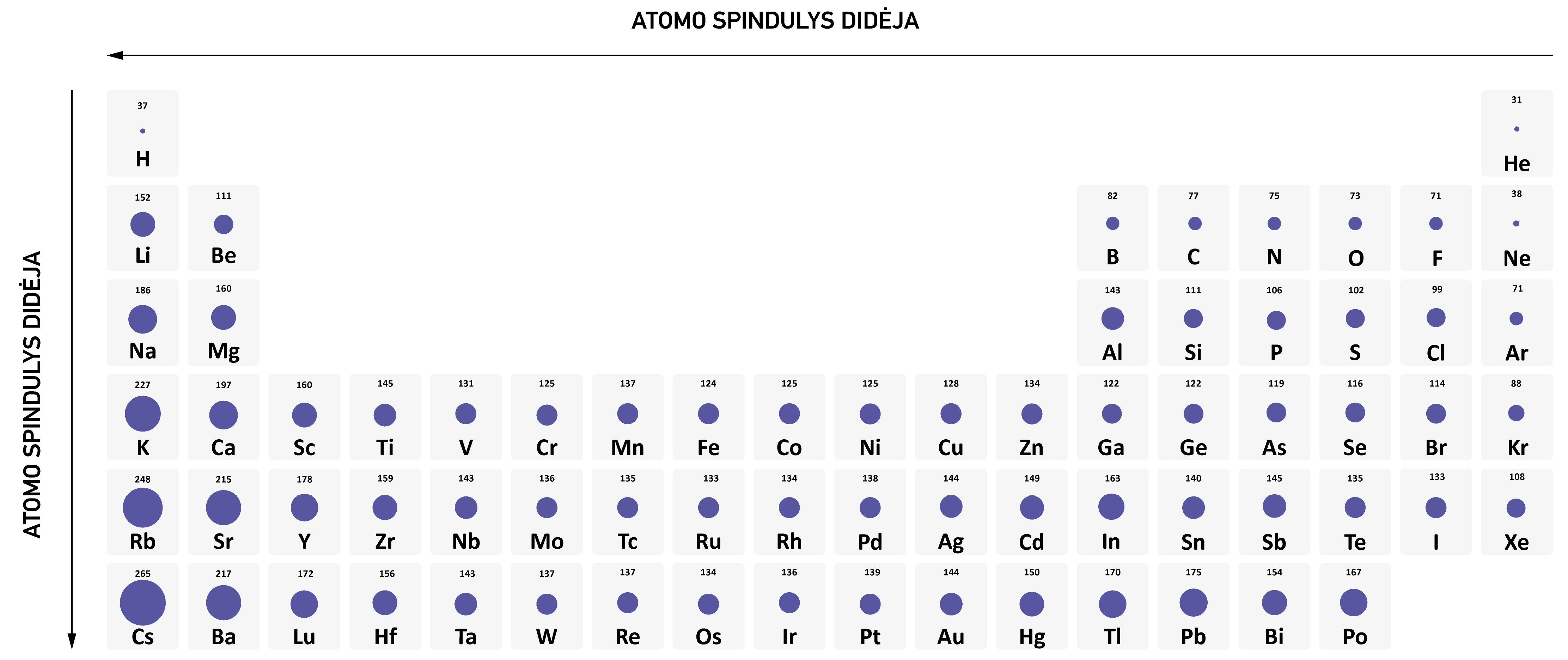 2.2.2.pav. Elementų atomų spindulių kitimas cheminių elementų sistemoje.