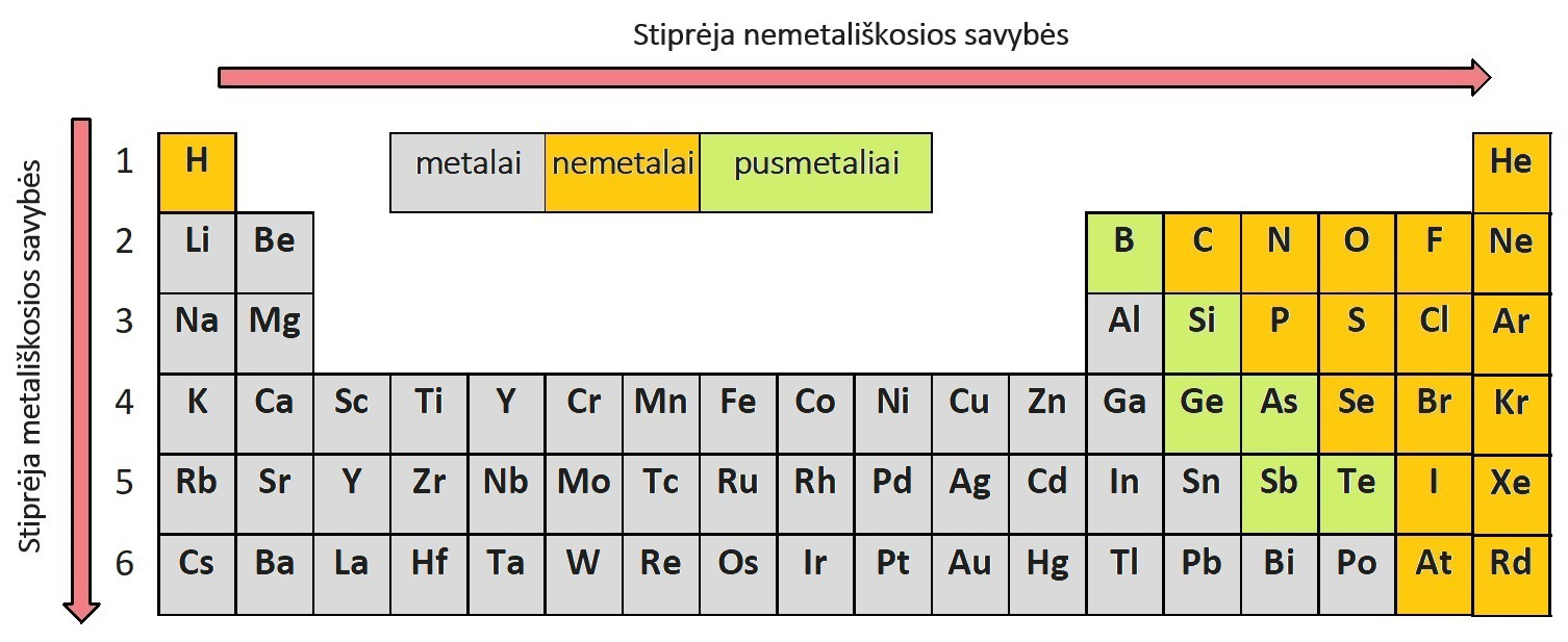 2.2.1. pav. Elementų metališkųjų ir nemetališkųjų savybių kitimas grupėse ir perioduose