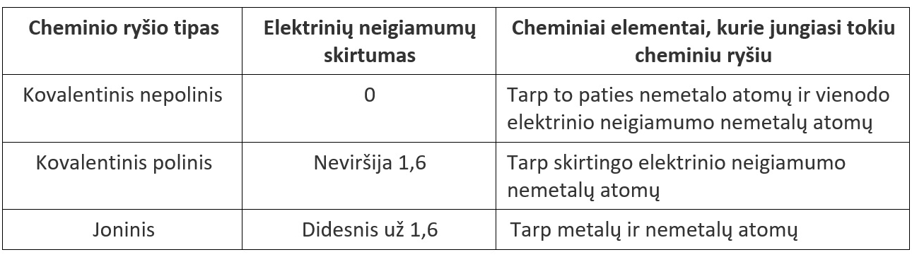 Cheminio ryšio tipas priklauso nuo cheminių elementų, sudarančių ryšį, elektrinio neigiamumo skirtumo (2.3.1. lentelė).