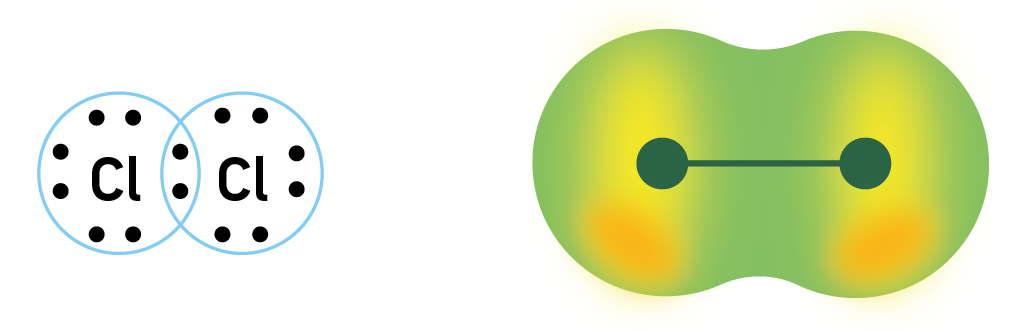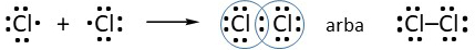Kovalentinio ryšio susidarymas tarp dviejų chloro atomų, susidarant Cl2 molekulei, gali būti pavaizduota panašiai: