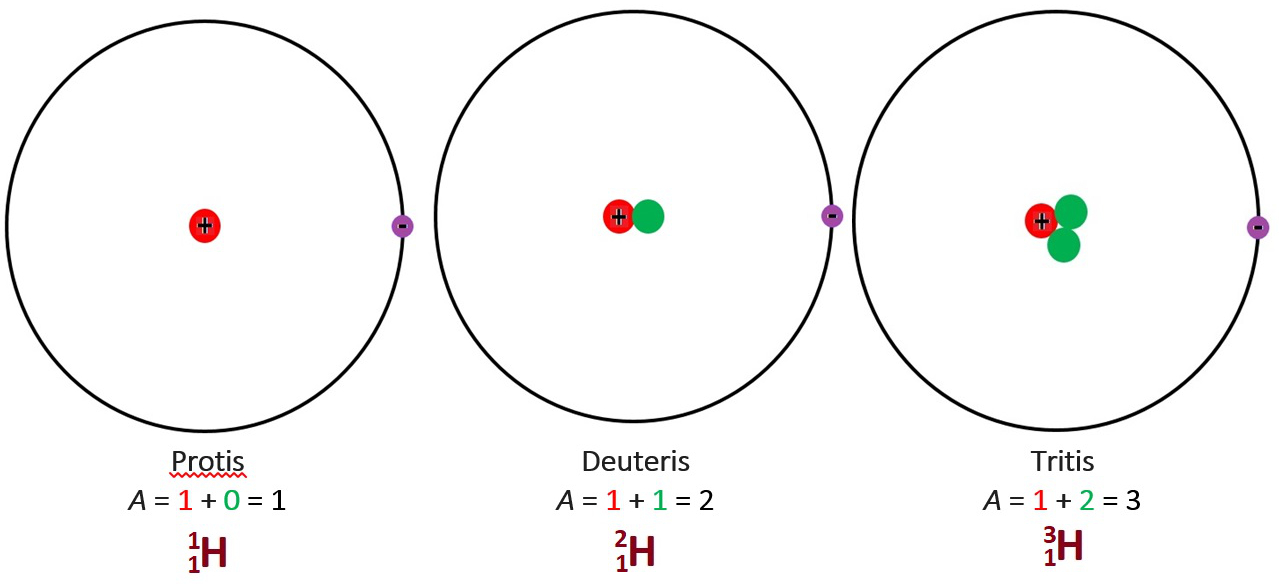 Daugumos vandenilio atomų branduoliuose yra 1 protonas ir 0 neutronų. Tačiau gamtoje egzistuoja ir tokie vandenilio atomai, kurių branduoliuose yra neutronų. Trys vandenilio izotopai yra protis (jo branduolyje yra tik 1 protonas), deuteris (jo branduolį sudaro 1 protonas ir 1 neutronas; kartais jis žymimas simboliu D) ir tritis (jo branduolį sudaro 1 protonas ir 2 neutronai; kartais jis žymimas simboliu T). Visų šių atomų branduoliuose yra tik po 1 protoną – visi jie yra to paties cheminio elemento atomai. Cheminės izotopų savybės yra vienodos.