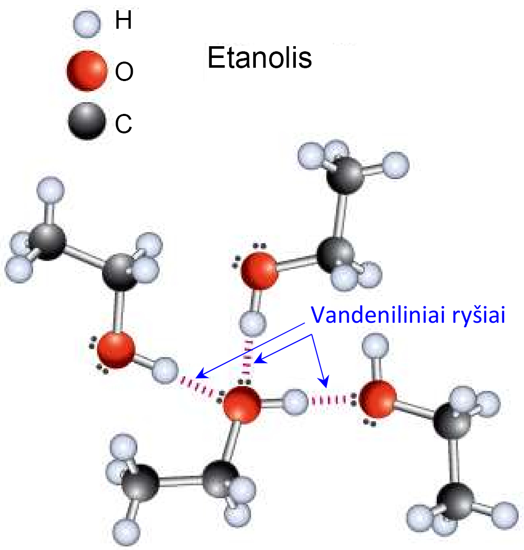 2.4.2. pav. Vandeniliniai ryšiai tarp etanolio molekulių