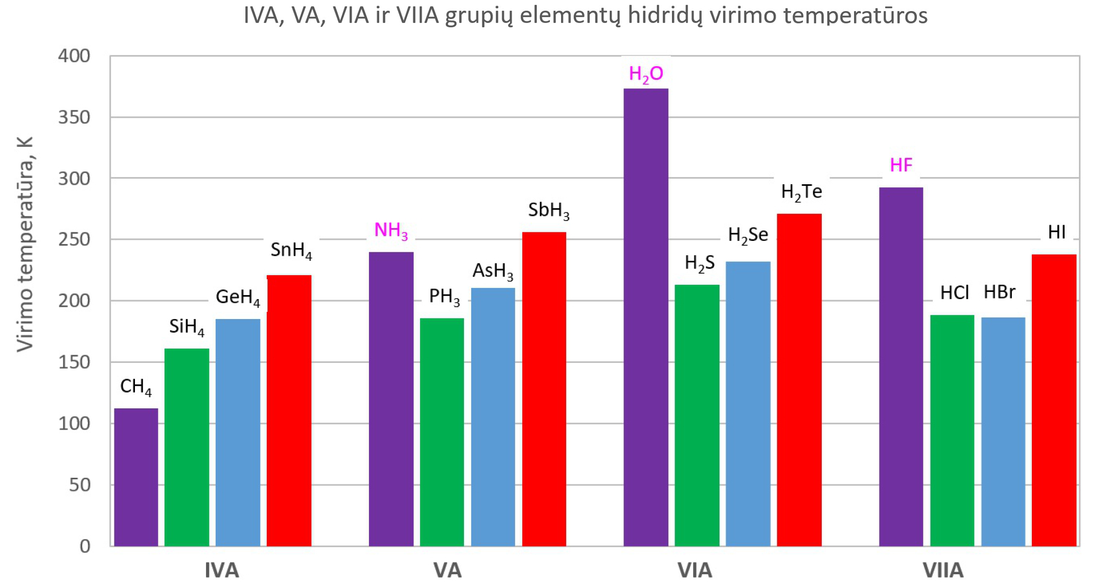 2.4.4. pav. IVA, VA, VIA ir VIIA grupių elementų hidridų virimo temperatūros
