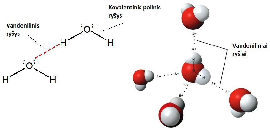 Vandenilinis ryšys schemose žymimas punktyrine linija, taip parodant, kad jis yra silpnesnis nei ryšiai molekulės viduje.