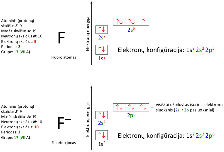Fluoro atomo ir fluorido jono elektronų konfigūracija