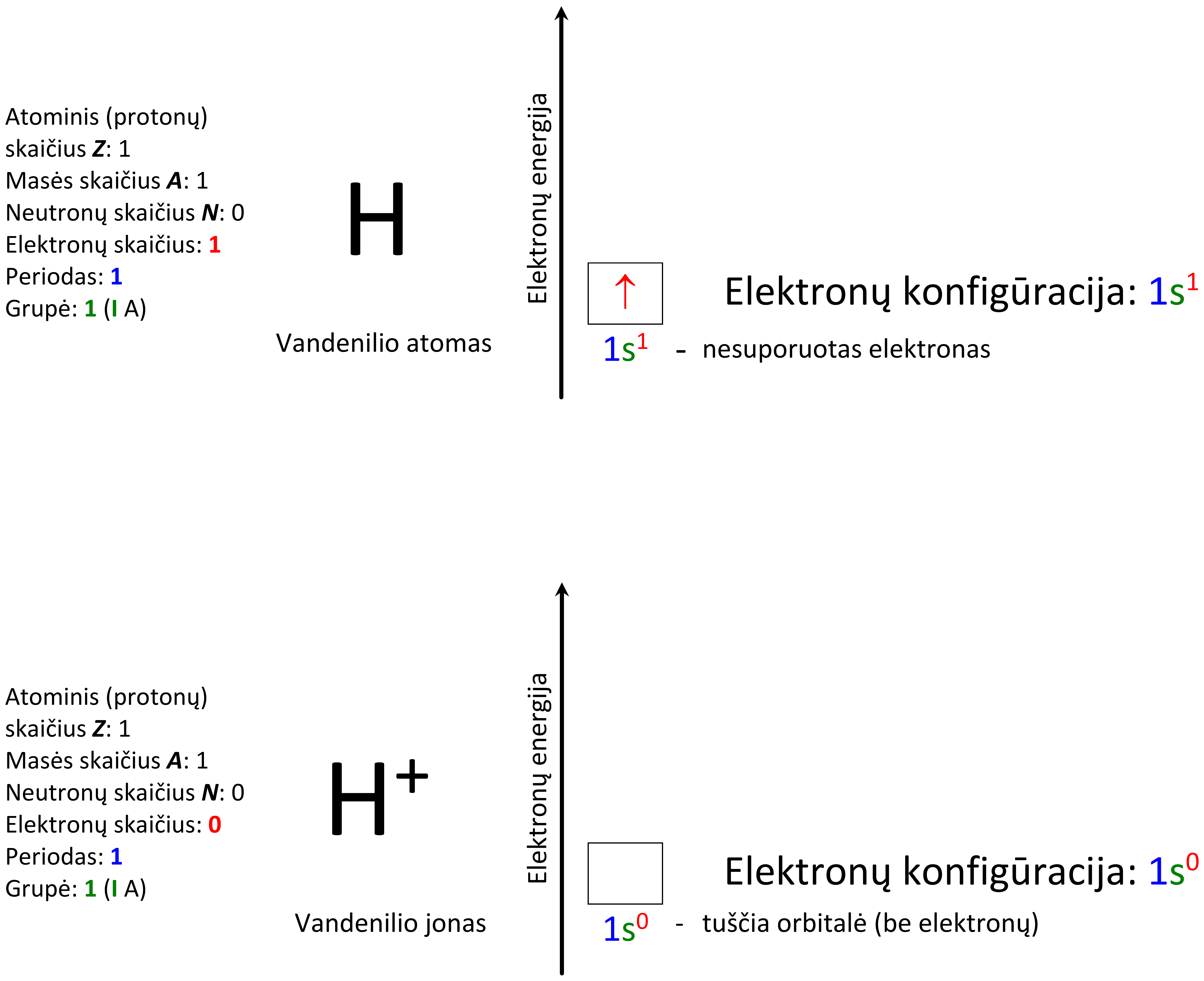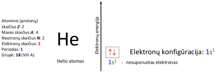 Vandenilio (H) atomo branduolyje yra 1 protonas ir atitinkamai aplink branduolį skrieja 1 elektronas. Antrasis elementas pirmajame energijos lygmenyje yra helis (He), kurio atomo branduolyje yra 2 protonai ir aplink branduolį yra 2 elektronai s orbitalėje (2.1.6. pav.).