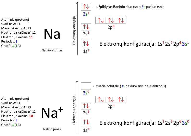 Svarbu: Atkreipkite dėmesį, jog neigiamų karbido C4-, nitrido N3-, oksido O2-, fluorido F- jonų bei teigiamų natrio Na+, magnio Mg2+ bei aliuminio Al3+ jonų elektroninės konfigūracijos yra vienodos ir sutampa su neutralaus neono (Ne) atomo elektronine konfigūracija. Tokią pačią vienodą jonų elektronų konfigūraciją su VIIIA grupės elementu galime sudaryti ir su kitų periodų elementais.