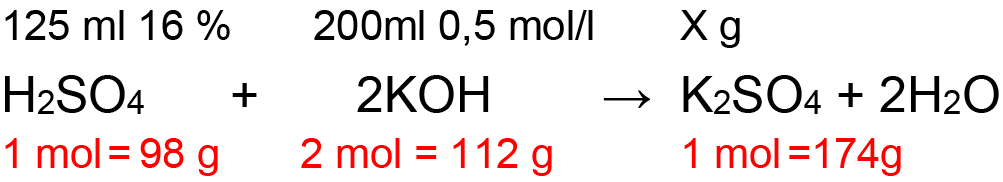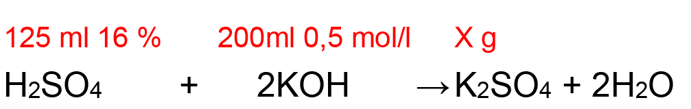 2. Kiek gramų neutraliosios druskos susidarys reaguojant 125 ml 16 % ( d=1,109 g/cm3) sulfatinės rūgšties su 200 ml 0,5 mol/l kalio šarmo.