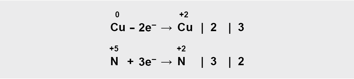 Prisijungtų elektronų skaičius turi būti lygus atiduotų elektronų skaičiui, todėl parenkami daugikliai (šiuo atveju 3 ir 2)