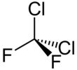 CFCl3 ir CF2Cl2 molekulių struktūrinės formulės (aukščiau) ir rutuliniai modeliai (žemiau)