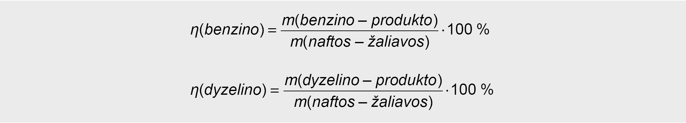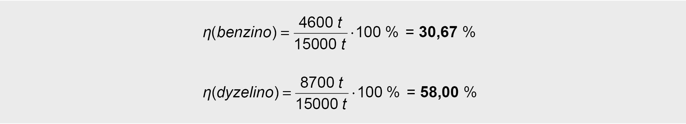 Perdirbant naftą yra gaunama labai daug įvairių jos perdirbimo produktų. Tačiau didžiausią dalį sudaro degalai – benzinas ir dyzelinas. Benzinas – tai degus skystis, priskiriamas lengvajai arba lakiajai naftos distiliacijos frakcijai ir daugiausiai susidedantis iš angliavandenilių, kurių molekulės turi nuo 6 iki 8 anglies atomų, mišinio. Dyzelinas – tai degus, tačiau mažiau lakus nei benzinas, skystis, priskiriamas vidutinei naftos distiliacijos frakcijai ir daugiausiai susidedantis iš angliavandenilių, kurių molekulės turi nuo 9 iki 20 anglies atomų, mišinio. Apskaičiuokite benzino ir dyzelino išeigas, jeigu žinoma, jog naftos perdirbimo gamykla per parą perdirba 15000 tonų naftos ir pagamina 4600 tonų benzino ir 8700 tonų dyzelino.