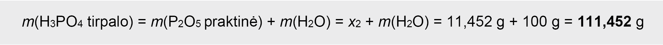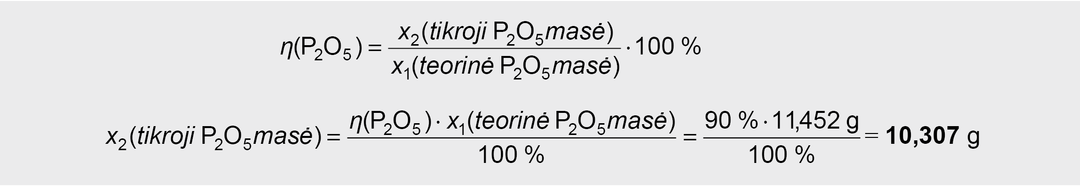3. Įvertinus fosforo(V) oksido P2O5 susidarymo reakcijos išeigą, apskaičiuojama tikroji fosforo(V) oksido P2O5 masė x2: