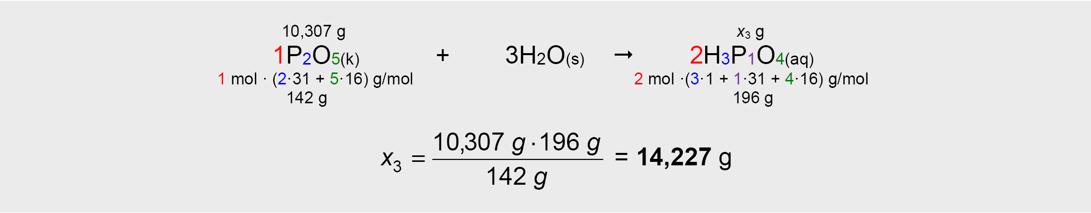 4. Pagal antrąją reakcijos lygtį, imant tikrąją fosforo(V) oksido P2O5 masę x2, apskaičiuojama susidariusios ortofosfato(V) rūgšties masė x3. Kadangi sąlygoje antrosios reakcijos išeiga neminima, todėl laikoma, kad ji yra lygi 100 %, t.y. praktinė susidariusios ortofosfato(V) rūgšties masė yra lygi teorinei masei x3: