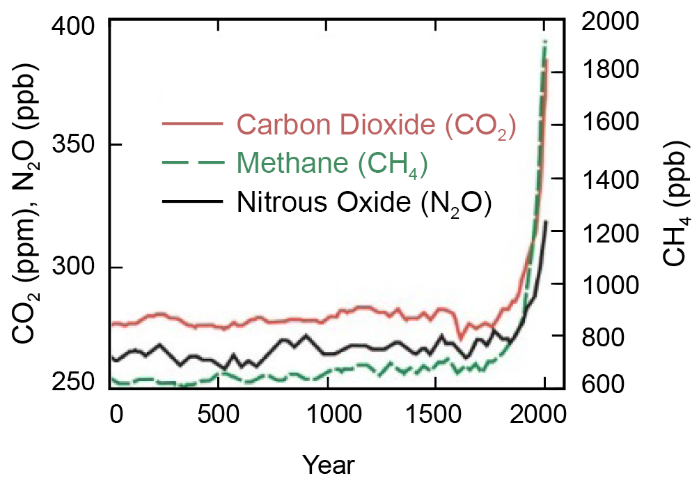 Per pastaruosius 200-250 m., dėl žmonijos intensyvios pramoninės veiklos pradėjus deginti vis daugiau iškastinio anglies turinčio kuro (akmens anglių, gamtinių dujų, perdirbtos naftos produktų), CO2 ir CH4 koncentracijos atmosferoje padidėjo atitinkamai 1,35 ir 2,5 karto. Šių dujų koncentracijos padidėjimas sparčiausiai vyko XX amžiaus antroje pusėje. Prognozuojama, kad per XXI amžių dėl oro taršos ir su tuo susijusių atmosferos sudėties pokyčių Žemės paviršiaus temperatūra gali pakilti nuo 2 iki 4 °C. Tai gali smarkiai paveikti pasaulinį klimatą ir turėti sunkių padarinių žmonijai. Norint sušvelninti šiuos padarinius, reikia kardinaliai sumažinti šiltnamio efektą sukeliančių dujų išmetimą į atmosferą sumažinat iškastinio kuro naudojimą šiluminei ir elektros energijai gauti bei transporte. Tai galima pasiekti vis daugiau energijos gaunat iš atsinaujinančių šaltinių (saulės, vėjo, energetinių augalų)