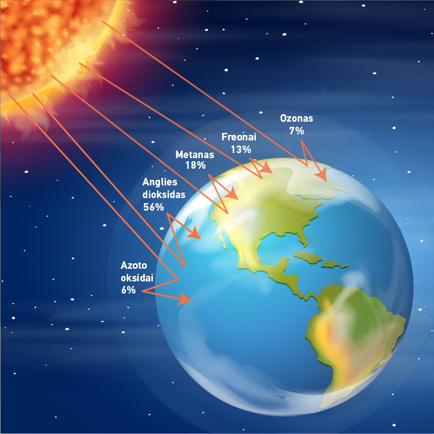 Skaičiai paveiksle parodo, kokią šiluminės spinduliuotės dalį atspindi atitinkamos atmosferos dujos.