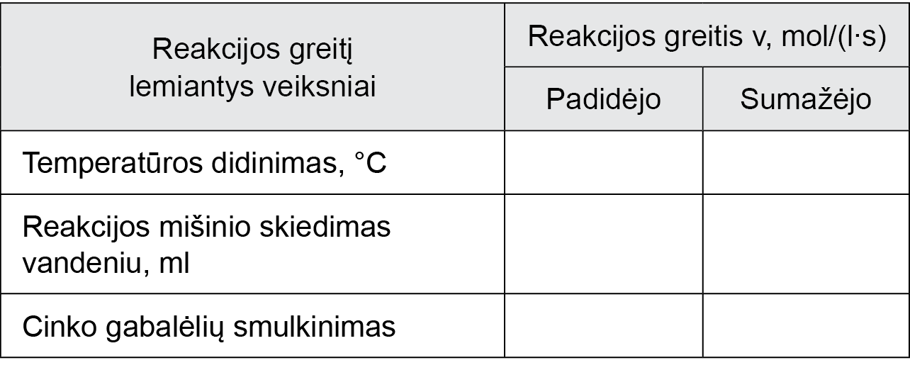 reakcijos greičio v (mol/(l×s)) priklausomybę nuo įvairių šių veiksnių: temperatūros, skiedimo vandeniu bei cinko gabalėlių smulkinimo.