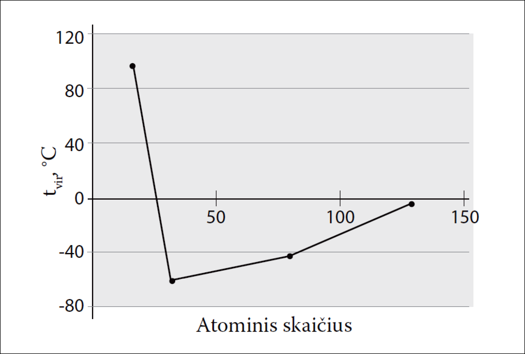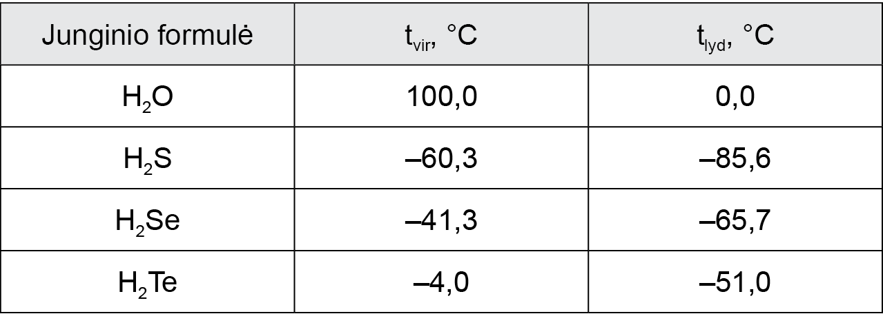 1. Naudodamiesi lentelėje pateikta informacija nubraižykite grafiką, vaizduojantį hidridų virimo temperatūros priklausomybę nuo nemetalo, esančio VIA grupės hidrido formulėje, atominio skaičiaus.