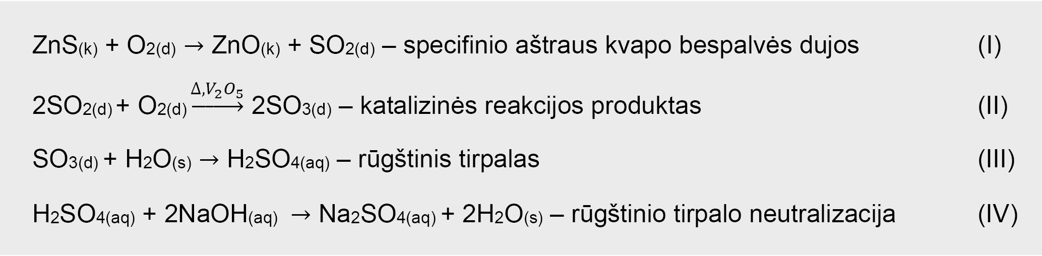 Sudeginus (iškaitinu) ore nežinomą masę cinko(II) sulfido ZnS, išsiskyrė specifinio aštraus kvapo bespalvės dujos. Šios dujos, praturtintos deguonimi, buvo praleistos virš įkaitinto V2O5 katalizatoriaus. Virš jo praėjusių karštų dujų mišinys – katalizinės reakcijos produktas su nesureagavusio deguonies pertekliumi – buvo praleistas pro vandenį. Gautas rūgštinis tirpalas, kurio neutralizacijai buvo sunaudota 20 ml 1,0 mol/l koncentracijos NaOH tirpalo. Apskaičiuokite sudeginto ore ZnS masę.