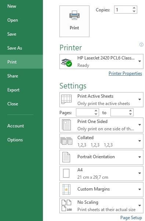 • Spausdinti aktyvų darbalapį (Print Active Sheets).