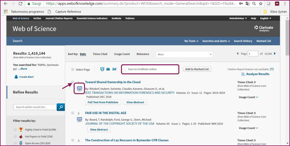 - Prie išsaugotų įrašų atsiras raidės EN, o įrašai bus išsaugoti programoje EndNote