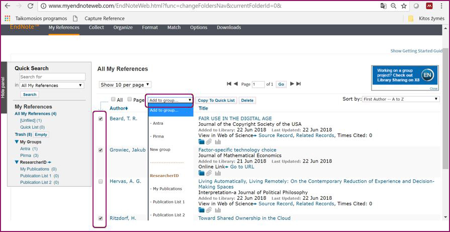 - Langelyje Add to group pasirinkite grupę, į kurią norite perkelti pažymėtus įrašus (žr. 13 pav.). Įrašai bus perkelti į pasirinktą grupę.