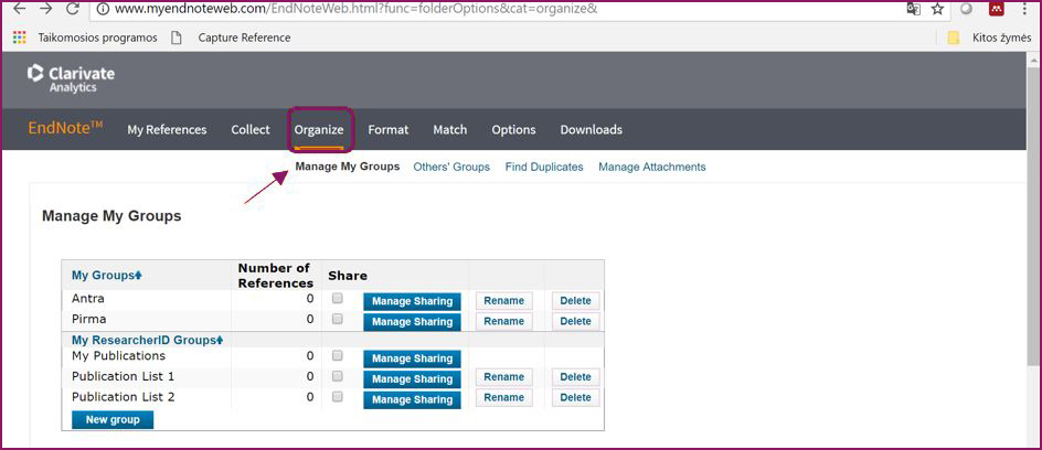 Grupes, kuriose esančiais įrašais kiti asmenys pasidalijo su jumis, rasite pasirinkę nuorodas Organize ir Others‘ groups.