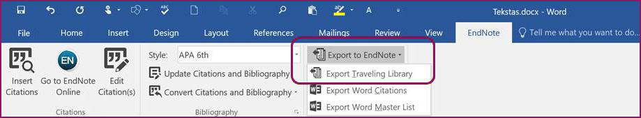 Spustelėkite programos Microsoft Word įrankių juostoje esantį mygtuką Export to EndNote (žr. 23 pav.). Pasirinkite komandą Export Traveling Library. Visi straipsnyje panaudoti šaltiniai bus įkelti į Unfiled grupę.