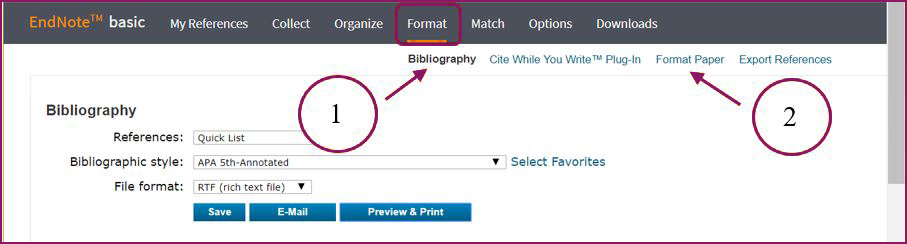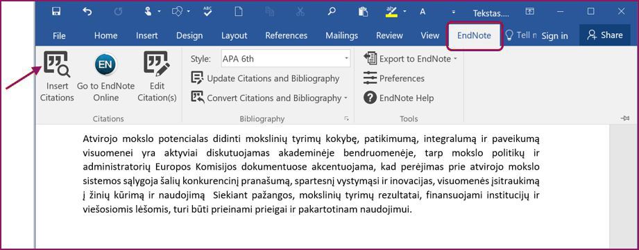 Jeigu norite formatuoti tekste įterptas nuorodas ir literatūros sąrašą be programos EndNote įskiepių, galite naudoti komandas Format ir Format Paper (žr. 22 pav., 2). Atlikite šiuos veiksmus:- Dokumente, kurį planuojate išsaugoti RTF formatu, įterpkite nuorodas pagal 2 lentelėje pateiktas instrukcijas.