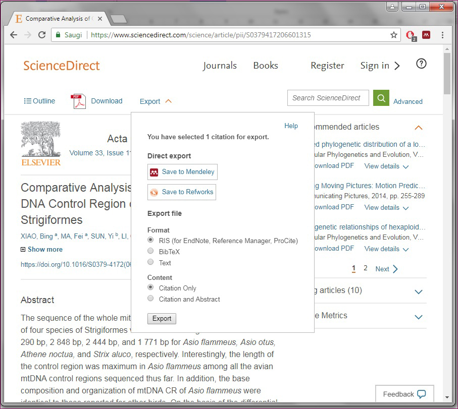 Norimą bibliografinį įrašą galite įkelti tiesiai iš duomenų bazės – tam duomenų bazėje turi būti eksportavimo į citavimo įrankius galimybė. Kai kuriose duomenų bazėse, pavyzdžiui, duomenų bazėje ScienceDirect, tokia galimybė yra (žr. 6 pav.).