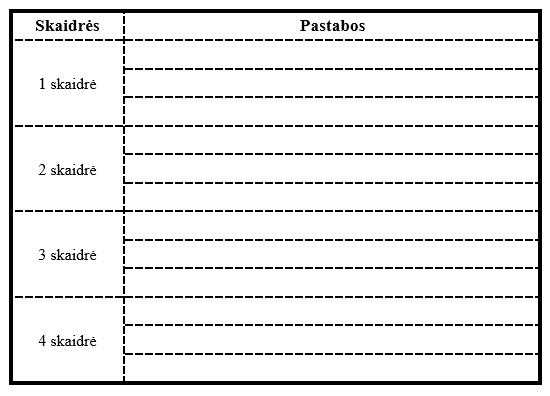 • į pirmo stulpelio langelius („1 Skaidrė“, „2 Skaidrė“, „3 Skaidrė“, „4 Skaidrė“). Teksto šriftas – Times New Roman, dydis – 12 pt, stilius – paprastas;