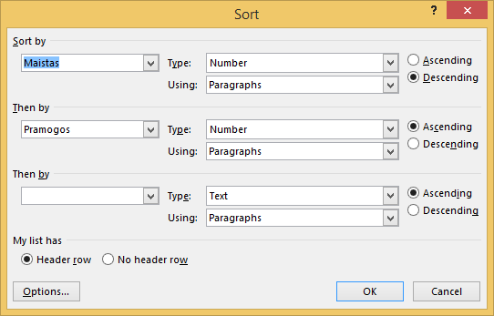 Patarimaslentelės duomenų rikiavimui naudokite tekstų rengyklės kontekstinio meniu Lentelės įrankiai (Table Tools) skirtuko Maketas (Layout) komandų grupės Duomenys (Data) komandą Rikiuoti (Sort). Tą pačią komandą galite rasti ir skirtuko Pagrindinis (Home) komandų grupėje Pastraipa (Paragraph). Nustatymai parodyti 4 pav.