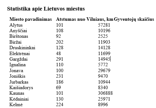 Sutvarkyta lentelė pateikta faile  1 rezultato pavyzdys.