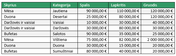 Pirmame skaičiuoklės lape atlikite rūšiavimą pardavimų duomenų lentelėje pagal pateiktą pavyzdį.