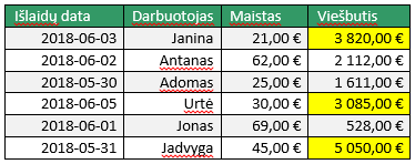 1. siekiant, kad stulpelio „Išlaidų data" duomenys būtų išdėstyti tam tikra tvarka, reikia dešiniuoju pelės mygtuku spustelėti stulpelį „Išlaidų data", po to pasirinkti Rūšiuoti. Rūšiuoti nuo seniausio iki naujausio (Sort. Oldest to Newest). Eilutės surūšiuojamos didėjimo tvarka pagal „Išlaidų datą";