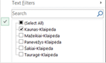 Pirmame skaičiuoklės lape (Tvarkaraščiai) atlikite tvarkaraščio filtravimą. Filtruokite keliones iš Kauno į Klaipėdą pagal žemiau pateiktą filtrą.