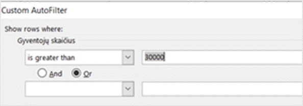 Antrame skaičiuoklės lape (Statistika) nufiltruokite įrašus pagal miestus, kuriuose gyvena daugiau kaip 30000 gyventojų, pagal žemiau pateiktą filtro pavyzdį.