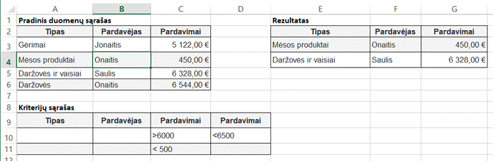 Penktame skaičiuoklės lape (Išplėstinis filtras) reikia rasti eilutes, kurios atitinka kriterijus (Tipas = "Daržovės ir vaisiai" AND Pardavimas > 1000).